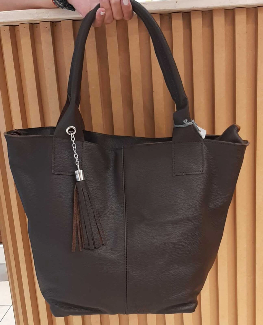 Cartera confeccionada en cuero vacuno con cierre. Detalle de monedero interno sostenido por cadena con flecos. Interior sin forrar.