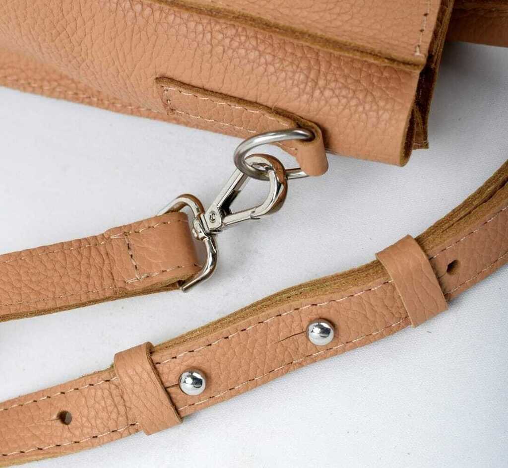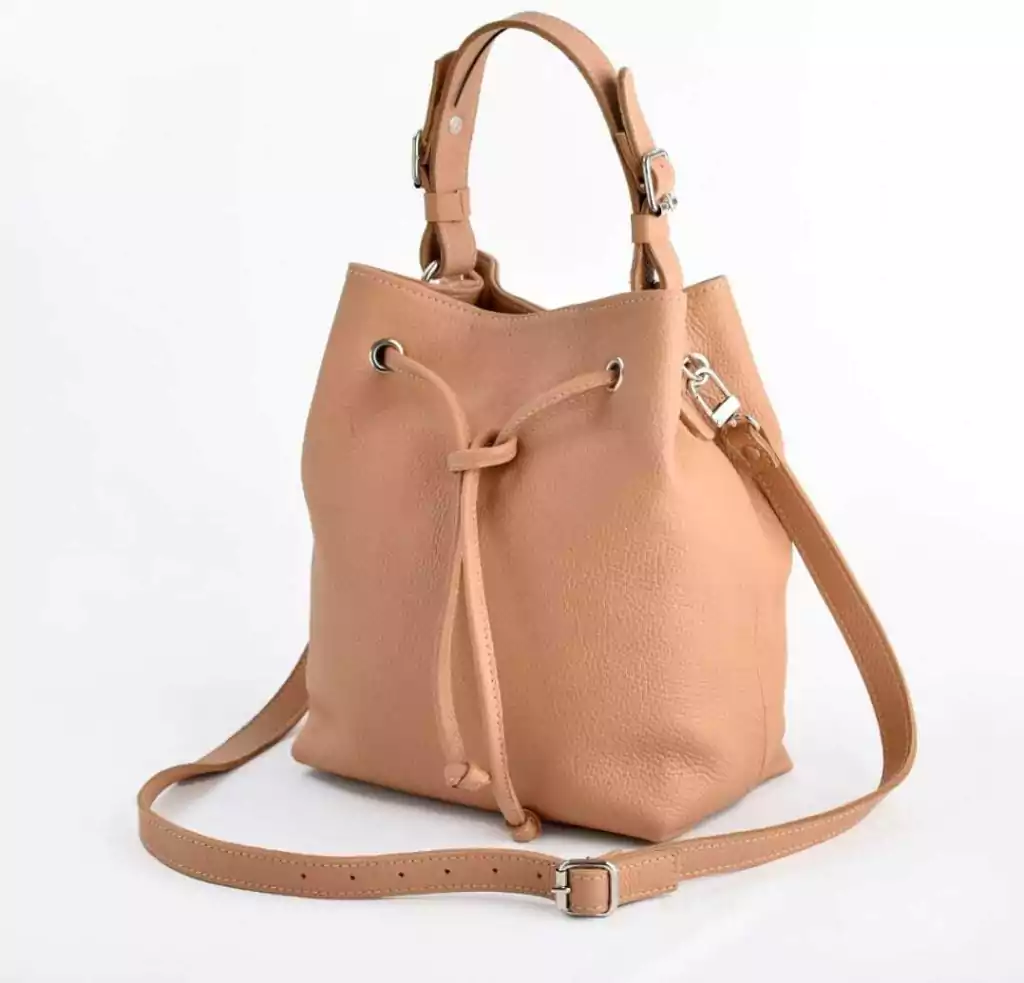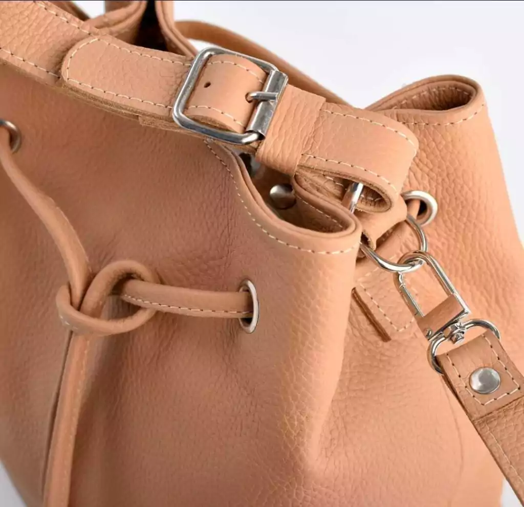 Cartera con manija corta y manija larga desmontable con mosquetones. Abre con tira.
