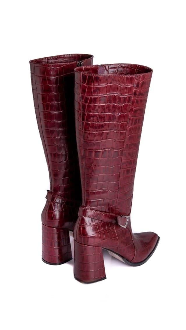 Bota alta en tono bordó con textura croco combina sofisticación y estilo urbano. Con punta fina, taco ancho y detalle de hebilla metálica, es el complemento ideal para elevar cualquier look de temporada.