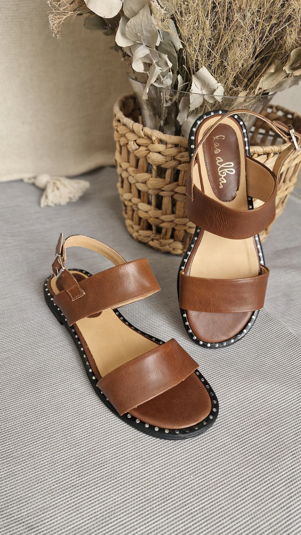 Sandalia base de goma con faja de cuero, forrada en cuero. Base de goma flexible super cómoda para caminar.
